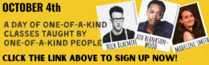 What is Choose-a-palooza? A fun afternoon of one-of-a-kind classes you can choose from that are taught by our amazing faculty members and Broadway professionals Nick Blaemire (Glory Days), Ato Blankson-Wood (Slave Play), and Madeline Smith (Waitress).